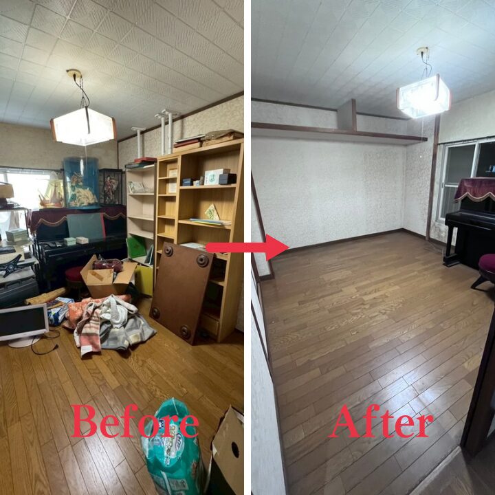 お部屋の中は生活用品や家具が多く残されており、物量は2tトラック複数台分に相当するボリュームでした。 お客様は「距離があるため、他社では断られたり高額な追加料金を言われないか」と心配されていましたが、カイケツホームではお見積り後の追加料金は一切ございませんので、安心してご依頼いただきました 。